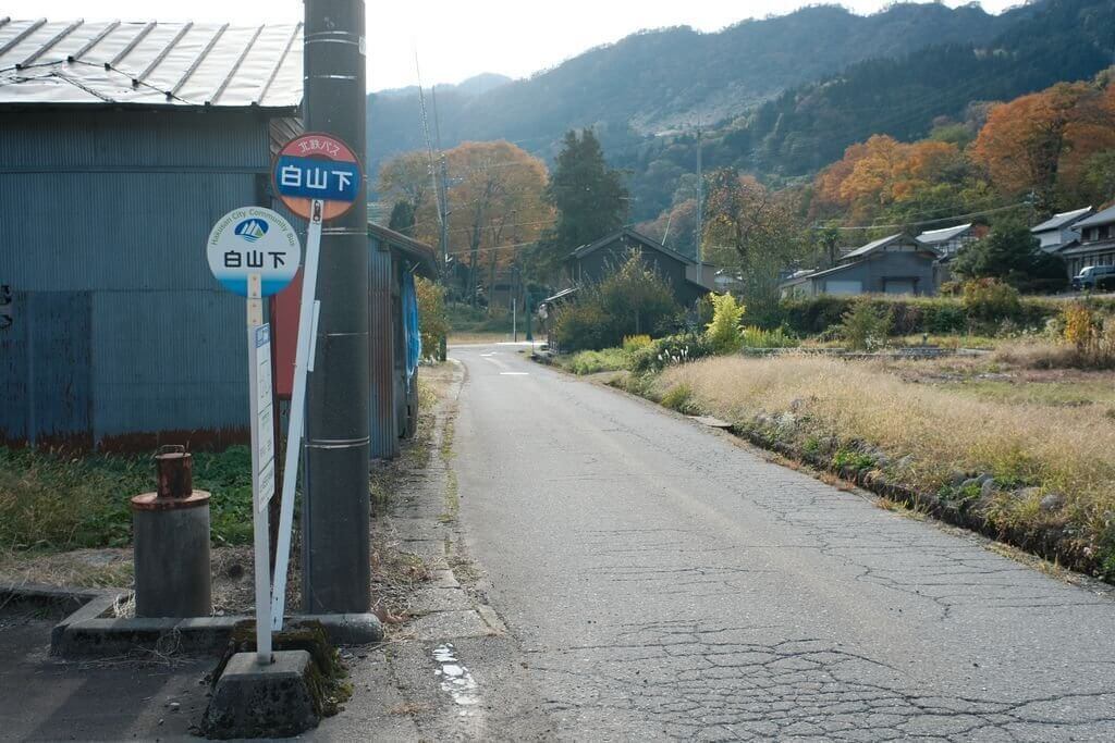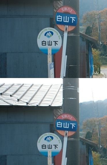 パッと見、わかりにくいですが、バス停看板を拡大します。下が正しいものです。上は表示板が上下に長くなっているのがわかると思います。