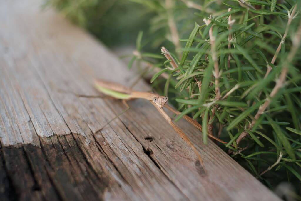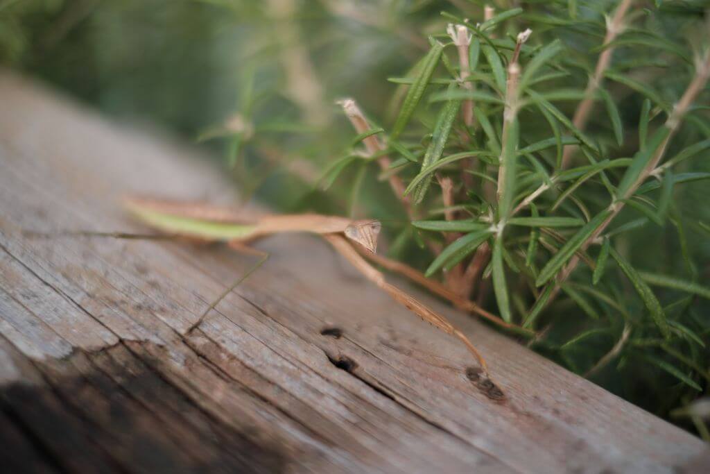 近距離、開放で撮るとピント面が薄くなります。ほんの数ミリでボケてきます。動くものであると難しいです。次の作例ですが、かまきりです。距離は20cmくらい、微調整は自分が動いています。こんな距離だと相手が警戒して微妙に前後します。肩が凝ること(笑)。結果、顔からピントが外れたようです。