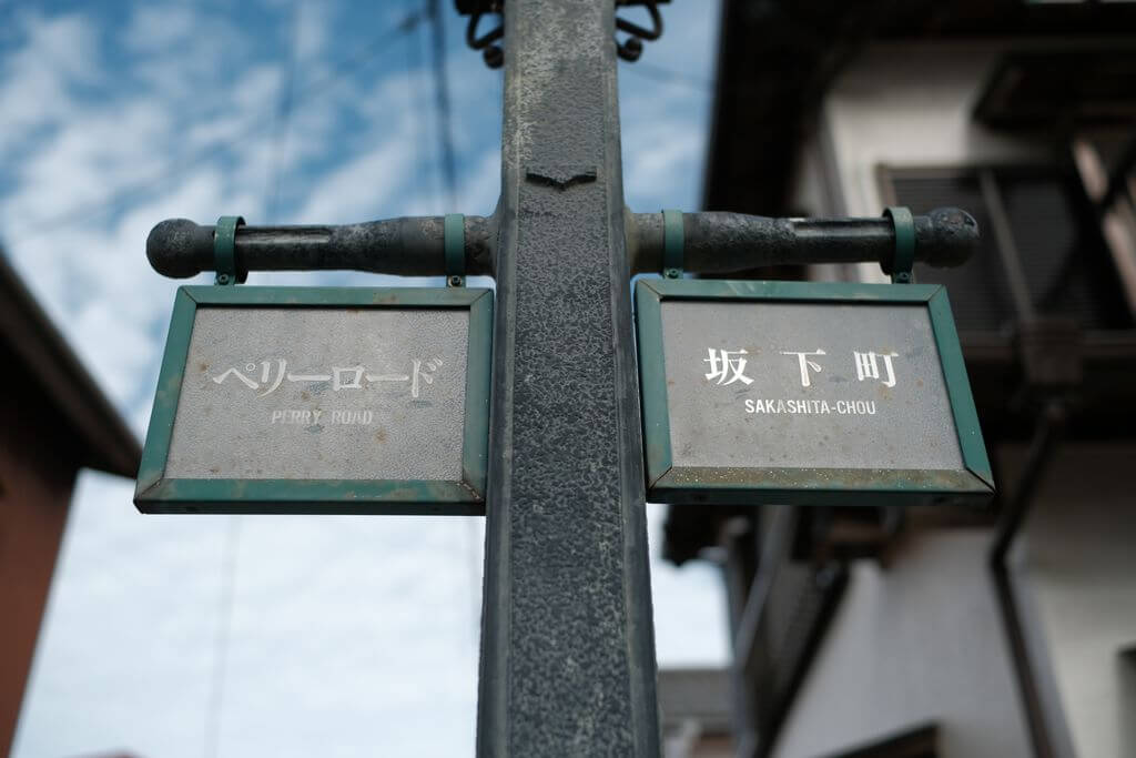 これがF2まで絞ると更に締まってきて、それがF5.6前後まで変わりません。絞りすぎは回折の影響が出るとありますから絞ってもF8で使っています。次の作例は下田市ペリーロードでの一コマです。表示板までの距離は約1メートル。絞りF2です。