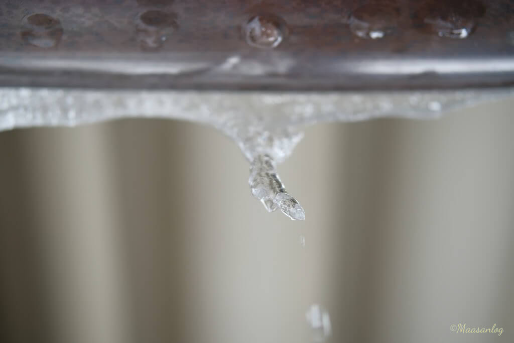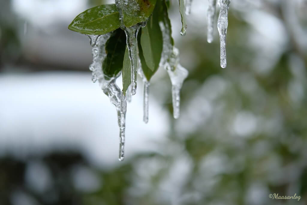午後になると気温はややプラスということで雪も解けだします。しかし風に冷やされてツララも長くなっていきます。絞りは共にF2。かなり寄っているのでここまでボケます。