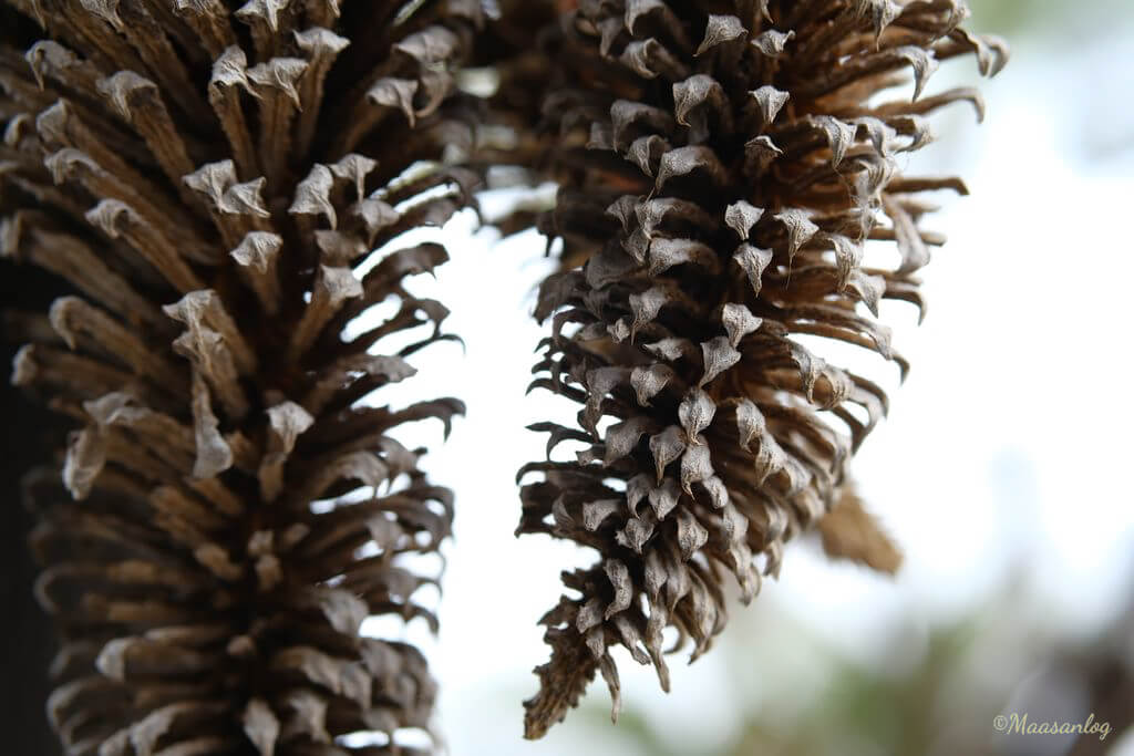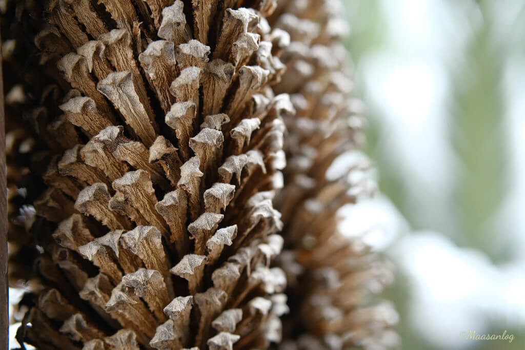 蘇鉄の雄花です。ぶら下げてあるものを近距離で撮っています。この直径は約10cmくらいですが、これだけ寄れます。