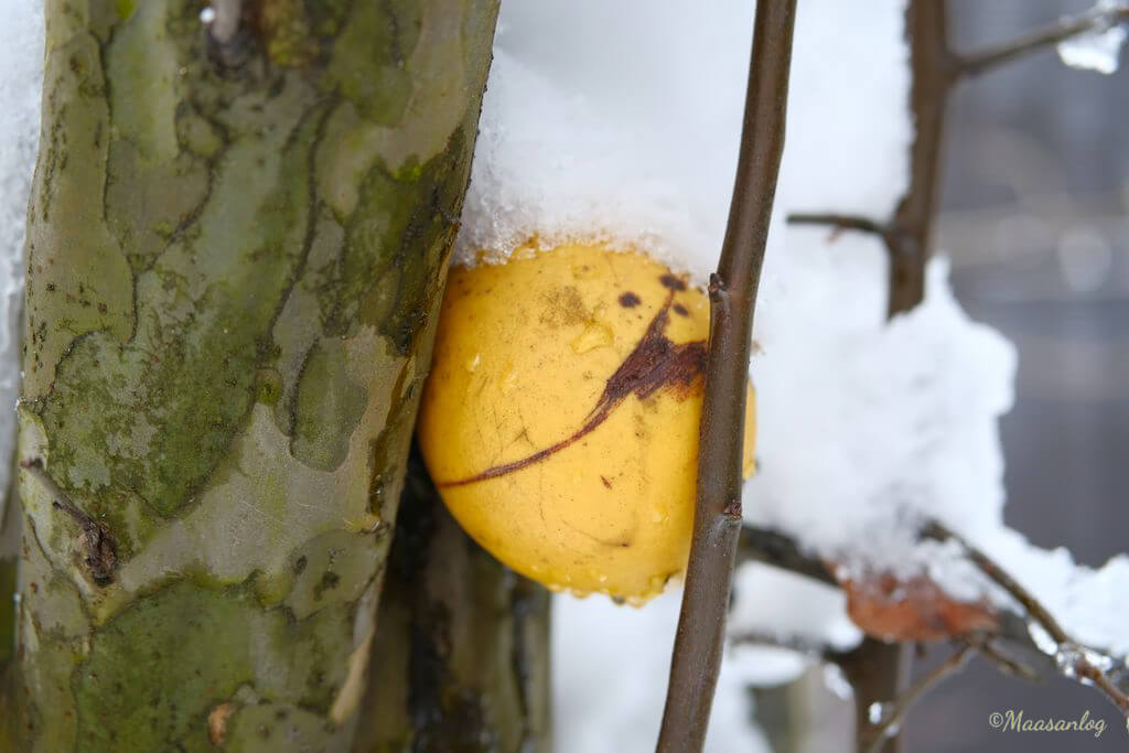 (左)花梨の実が落ちずに枝に挟まったままです。このまま春まで。