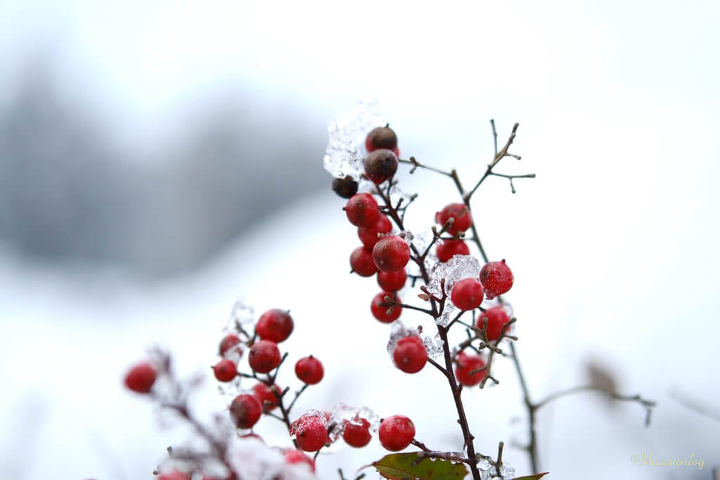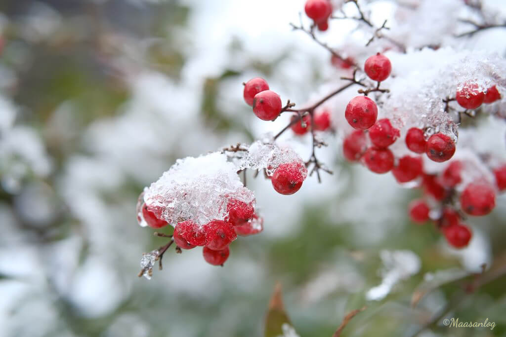 南天の実です。背景が白いのでプラス補正しています。最初がF2.8、次はF2です。