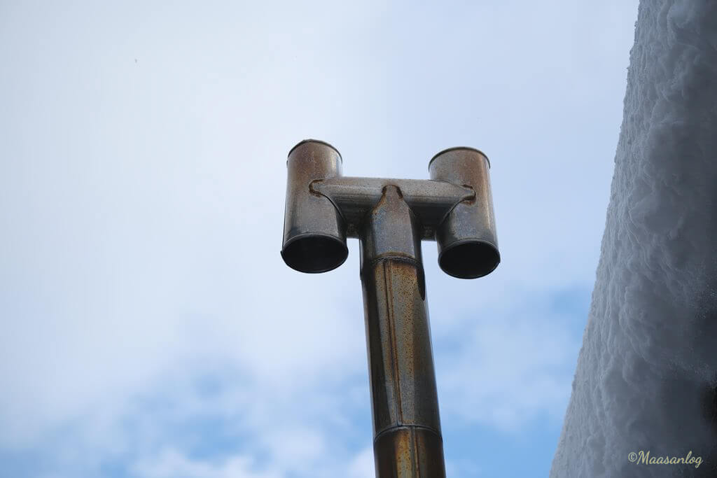 (右)見上げると金属製の煙突です。屋根雪のもっこり間と煙突の冷たい感じが似ているようです。