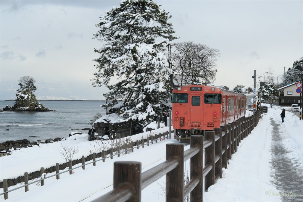 もう一つ中望遠の効果には圧縮作用が少しかかります。更に焦点距離が大きくなれば効果は強くなりますが、中望遠では少しです。このさり気ない?効果が利いてきます。例えば以下は雨晴海岸での電車の風景。線路、電車、海岸と遠くの風景などを比較して見ていただきたいのですが、こんな風景を標準か準広角で撮ると遠くの風景は小さく遠くなります。実際に目で見て感動したけれど、撮った結果を見ると小さくなっていて、ということがあります。しかしこの中望遠だと手前に背景を持ってくることができるので雰囲気を残すことが可能です。