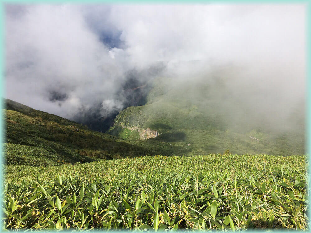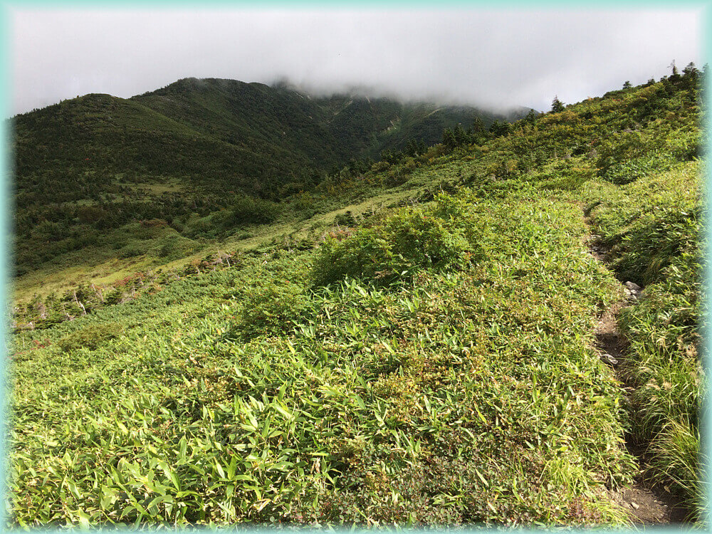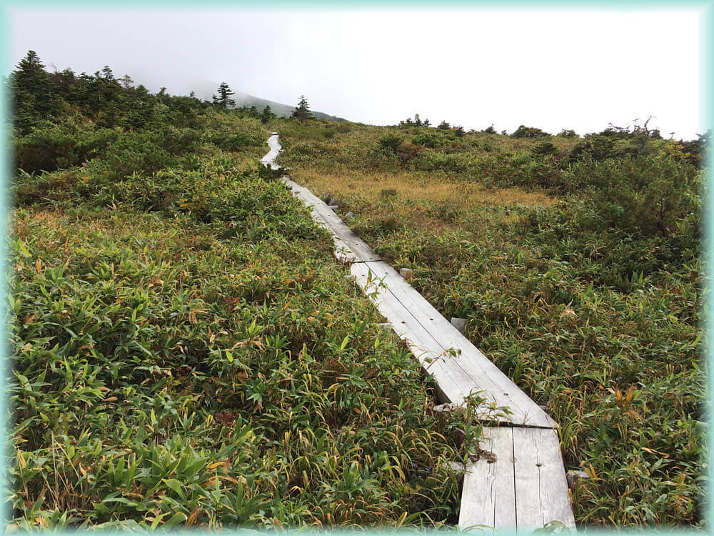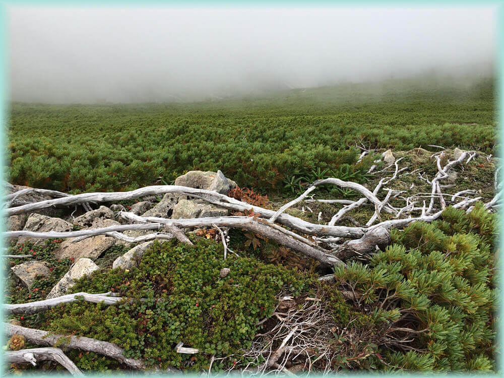 ちょうどガスがかかっていたせいもあるけど、一体何処へ行くんだろうかという気持ちでした。やや風が吹いていて、辺りは静か。鳥の囀りも聴こえず、ガスの中を行く。足元は這松で何となくいい香り。時折、クマらしき糞があったりしてやや緊張の山行。