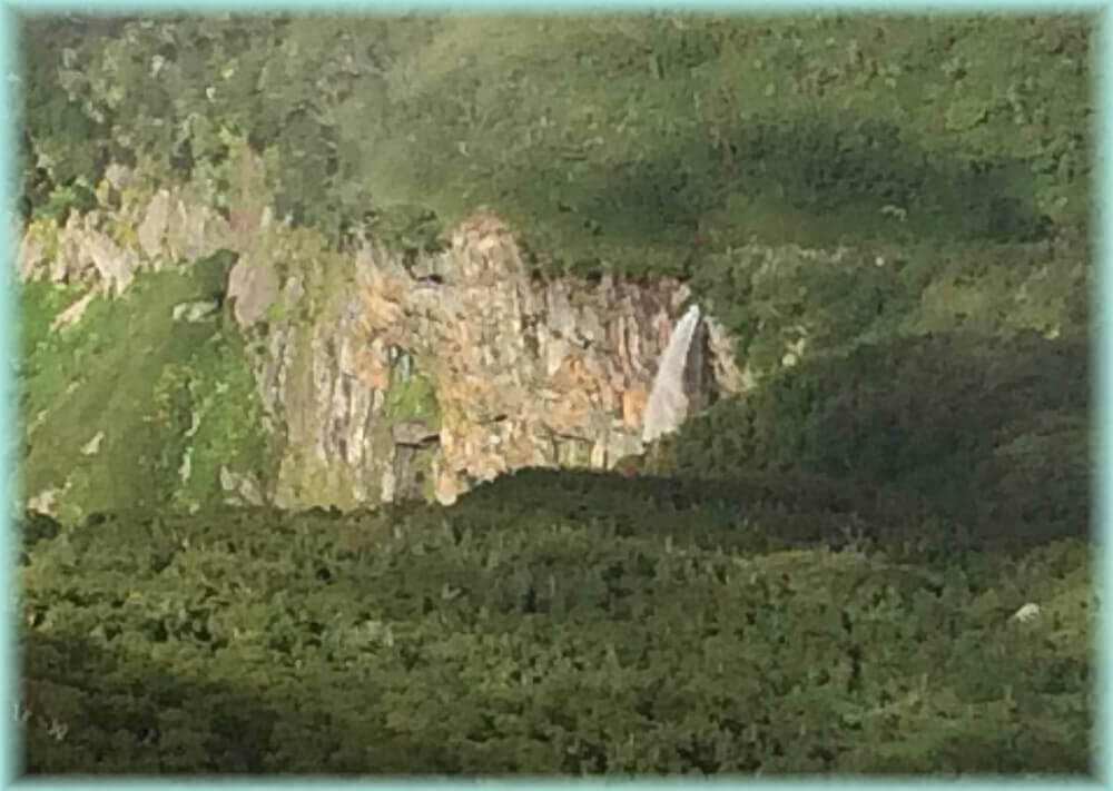 あいにくガスがかかっていて、最初はほとんど見えませんでした。時折薄っすらと姿を見せてくれていましたが突然ガスが切れ、見えました。もちろん音はごうごうと聞こえます。距離は1km程向こうだったように記憶しています。