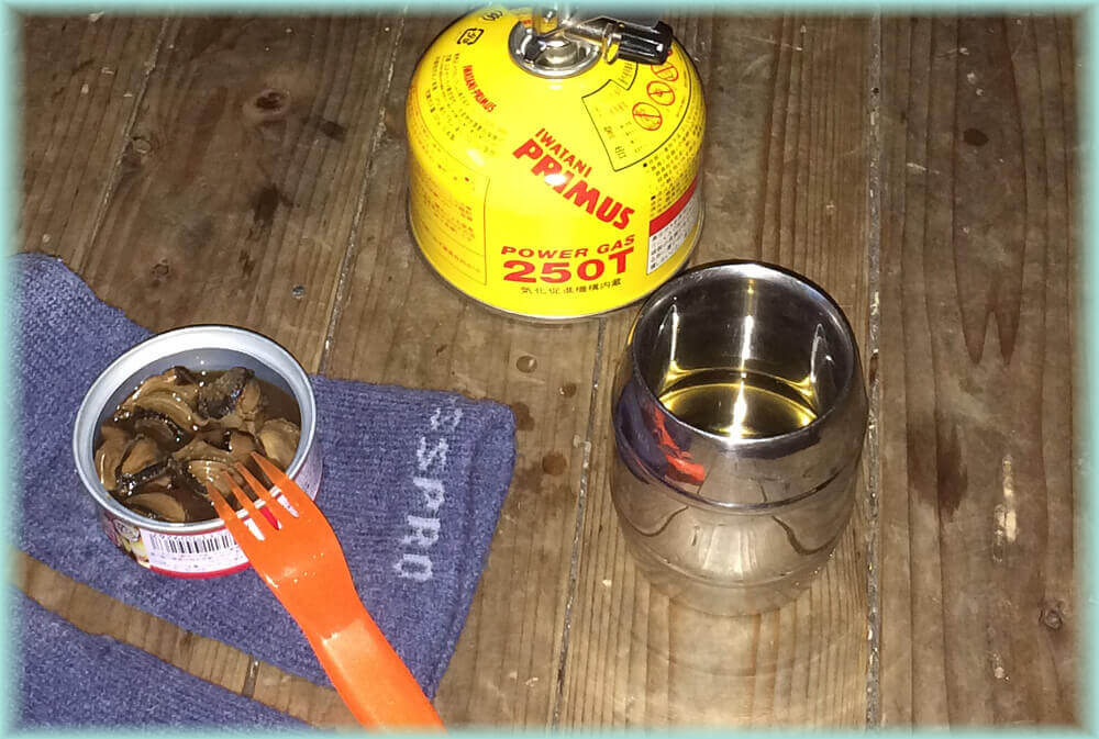 さて到着したら酒盛りです。缶詰、乾きもの、ウヰスキーをぬるい水で割ってでしたが、最高の孤独感で大満足。この孤独感と言うのは何と表現してよいかわかりませんが、寂しいとかそういうのとは全く無縁で、静かに時を過ごすという気持ちです。