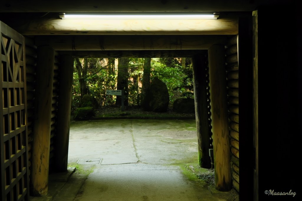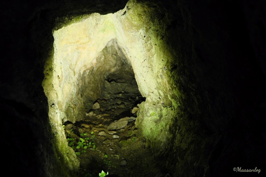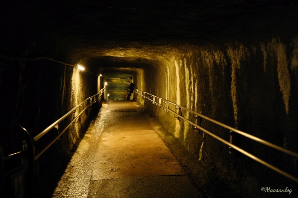 この間歩内、長さは600mあるらしいのですが、一般公開部分は200m台ということで目が慣れた頃には出口です。内部を進んでいくと横に狭い穴がいくつかあります。おそらく作業員が掘ったものでしょうが、横に鉱脈があるか、どうなっているかを調べたのか、それとも湧き水の処理なのかと想像しながら歩きました。