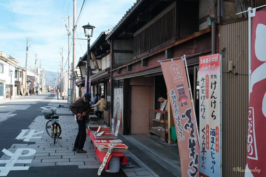味噌醤油屋さんの主人に聴いてみると、ここは朝市が立つそうです。「車両通行止」はおそらく道に置いて使うのかなと思います。主人曰く、「最近は店を出すばあさんも減っている」とのこと。今想ったのですが、朝市とくれば女性です。なぜじいさんではないのか。案外女性のほうがエネルギッシュで社交的であり、男性はある年齢以降は出不精で軟弱、恰好ばかり気にするせいかなと。